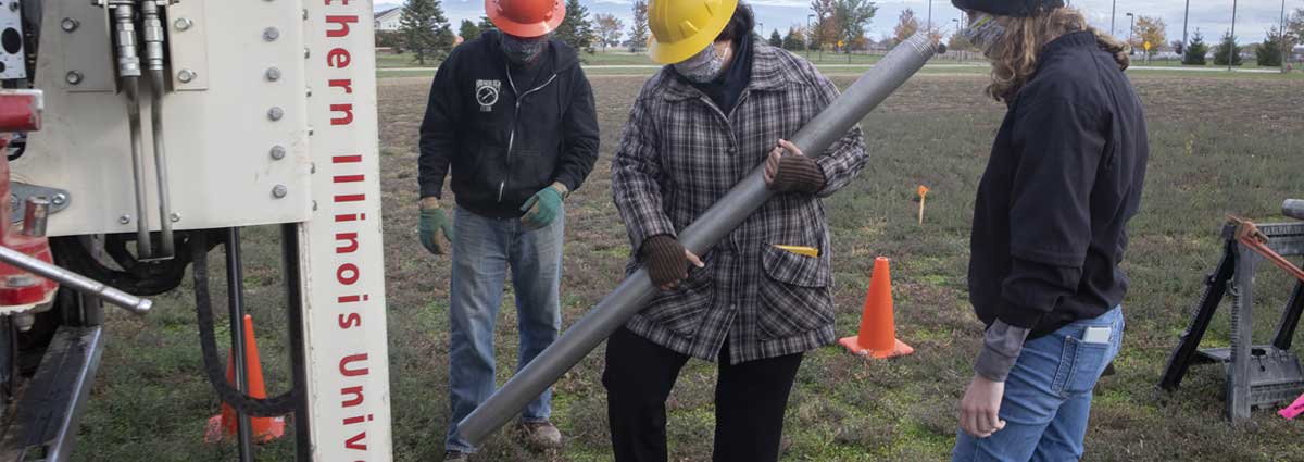 In the fall of 2020, Lenczewski and her team drilled seven monitoring wells on the restoration site just north of the NIU Convocation Center. The team collected 20-foot intact soil and sediment cores from each well. As part of their study, they'll analyze the cores to develop a deep understanding of the soil and sediment composition and the geologic history of the area.