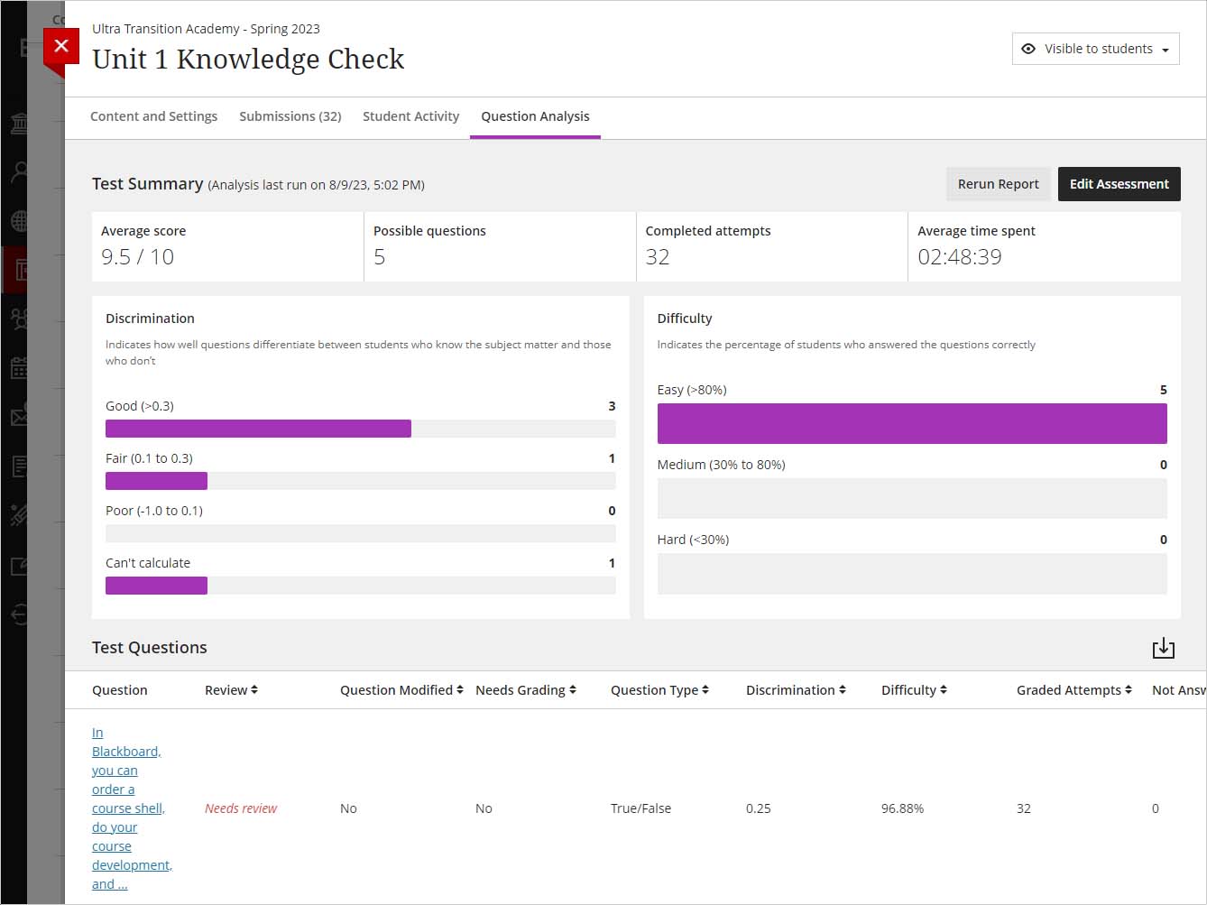 Question analysis provides statistics on overall performance, assessment quality, and individual questions. This data helps you recognize questions that might be poor discriminators of student performance. Question analysis is available for Tests. You can run a report before all submissions are in if you want to check the quality of your questions and make changes.