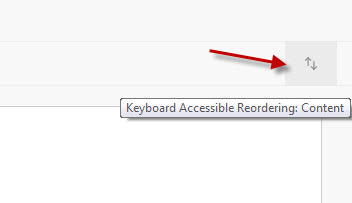 Both the Course Menu and Content Areas include simple button controls for reordering items, which can be used instead of the drag-and-drop method. While designed for assistive technologies, the "Keyboard Accessible Reordering" controls are useful for everyone. They can be found by clicking on the up and down arrow icon, either above the Course Menu, or on the right hand side of the bar containing the standard Content Area controls (such as the "Build Content" button) as seen in the screenshot below. From the panel that pops up, select the item you wish to move, then click on the small up or down arrow buttons to move the item to the desired place in the list. When done, click the Submit button.