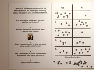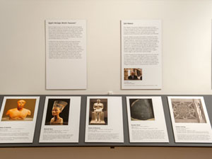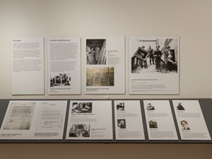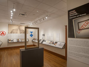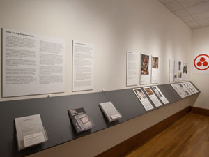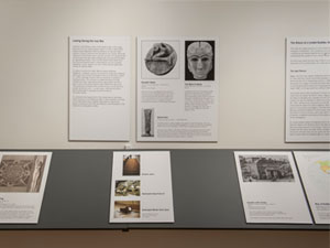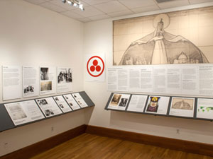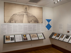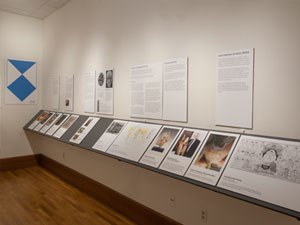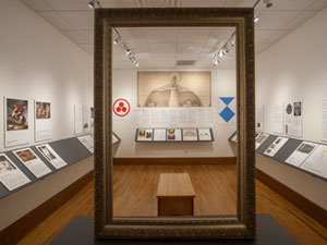 These images are from the exhibition installation at the NIU Art Museum. Due to the intimate scale of the museum's North Gallery, a ledge system was devised to increase the exhibit space. This allowed us to install the exhibition on 100 running feet of wall space. The empty frame seen in the center of the space does not travel with the exhibition.