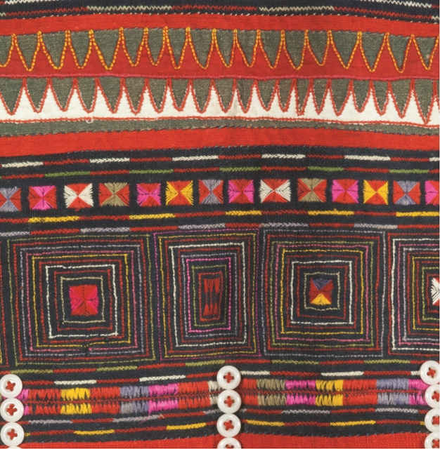 Woman’s Jacket. Akha People, Laos, Late 20th Century. Materials: Home-spun cotton, denim, Job’s tears seeds and buttons. Gift of Richard M. Cooler.
