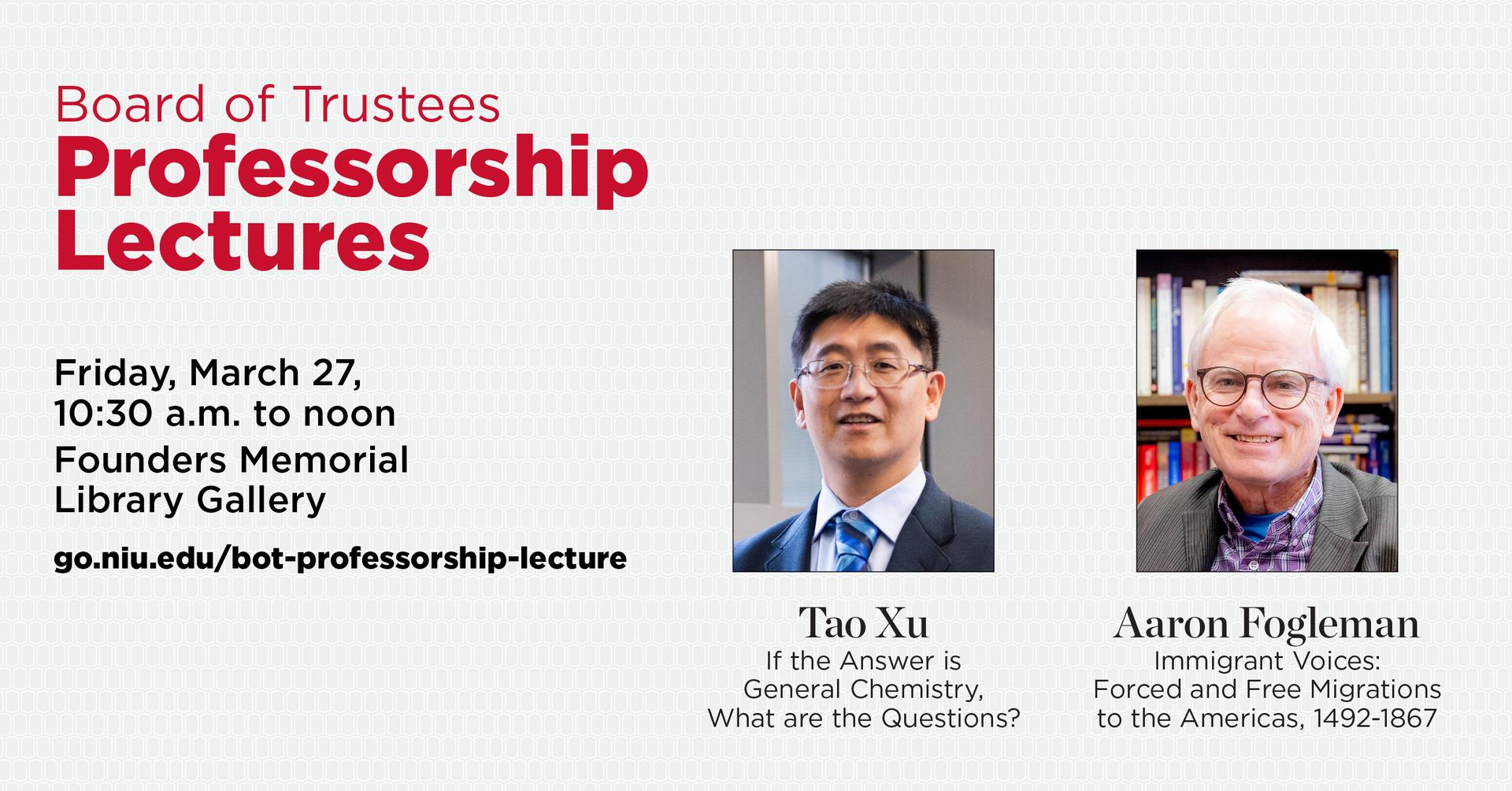 You are invited to this special event featuring presentations from Tao Xu, Board of Trustees Professor in the Department of Chemistry and Biochemistry, and Aaron Fogleman, Board of Trustees Professor and Distinguished Research Professor in the Department of History.